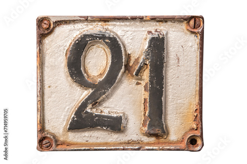 Old retro weathered cast iron plate with number 21 closeup isolated on white background