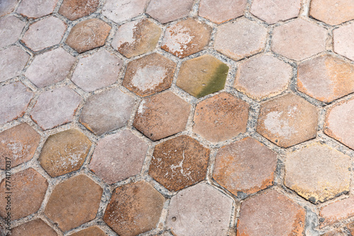 Old road pavement made of hexagonal tiles, background texture
