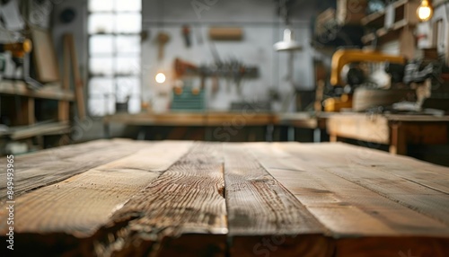 Old rustic wooden table with workshop interior as background. blurred image workshop with tools and window