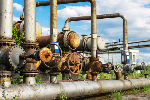 Old rusty valves are latches on the pipeline of an abandoned chemical plant .