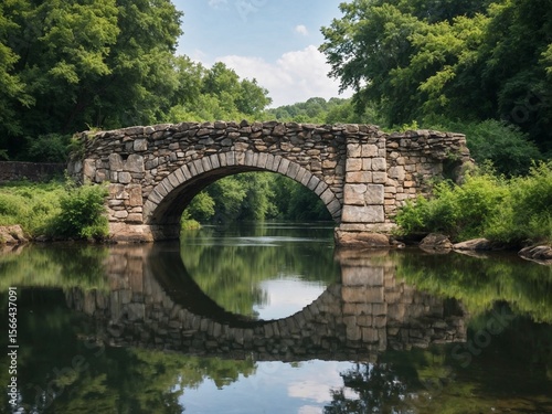 Old stone bridge crossing a calm river, lush greenery, reflection in water, daylight