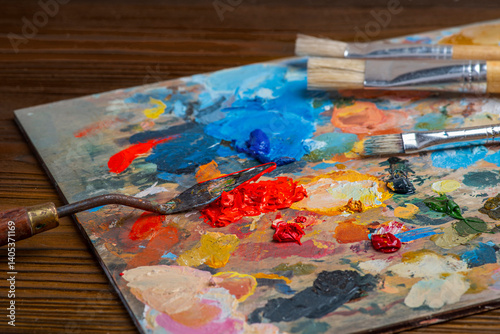Old used brushes and palette knife in an artist's studio, palette with multi-colored spots of oil or acrylic paint