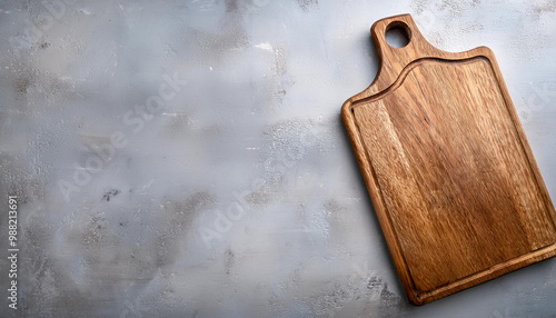 Old wooden cutting board on grey background. Top view. Copy space.