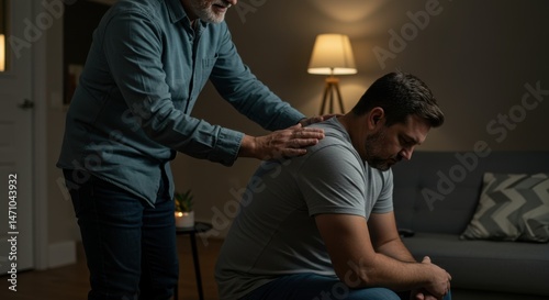 Older man comforting a younger man with hands on shoulders in a dimly lit living room setting