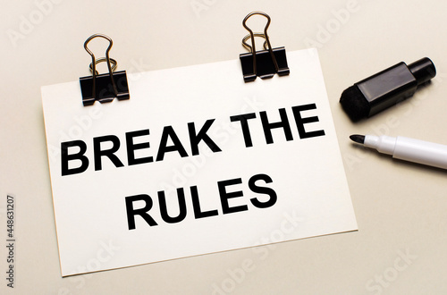 On a light background, a black open marker and on black clips a white sheet of paper with the text BREAK THE RULES