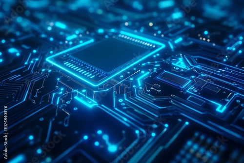 On a motherboard, there is a powerful computer processor or chip. Modern technologies. Blue background. Computer technology is evolving.