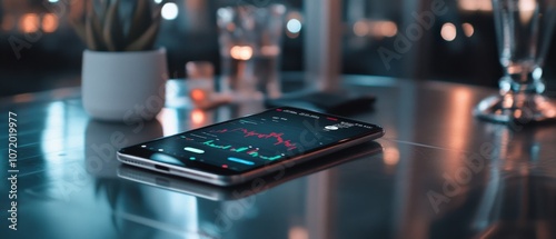 On a sleek table, a modern smartphone displays a financial graph, suggesting a focus on market analysis amidst a soft-lit setting.