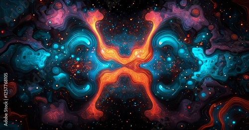 On an abstract background with a blur, blue futuristic hi-tech waves are accompanied by glowing pixel particles and light glare