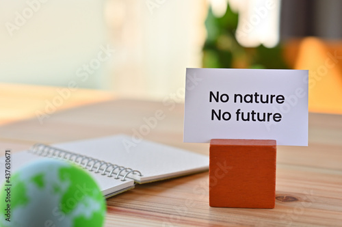 On the desk there is a ball of earth and a card with No Nature No Future written on it.