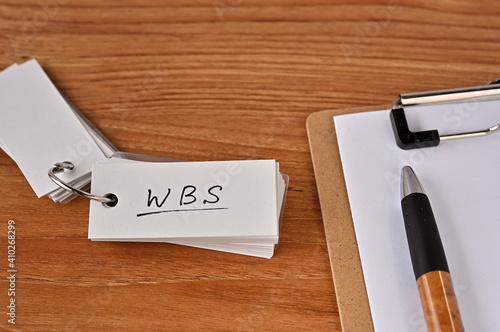 On the desk there is a laptop, a clipboard, and a word book with the word WBS written on it. It was an abbreviation for the financial term Work Breakdown Structure.