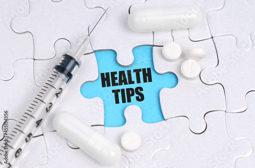 On the table are a stethoscope, pills, a thermometer and a notebook with the inscription - HEALTH TIPS
