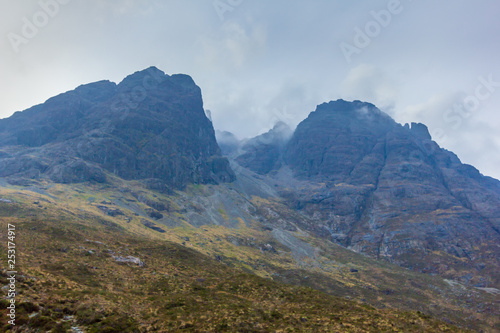 On the way to the Bla Bheinn mountain with a majestic rocky mountain and white altitude clouds
