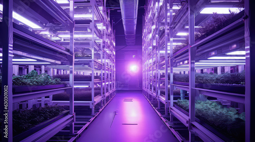 One - point perspective, Hydroponic vertical grow rack indoor farming, multiple rows and columns, growing lettuces and tomatoes, violet LED glow lights. Industrial Plant Cultivation.