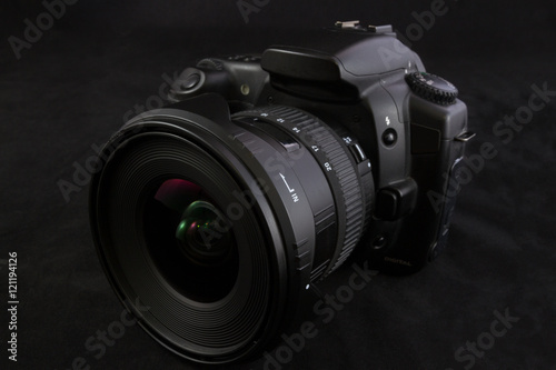 One black camera with wide angle lens isolated on black backgrou