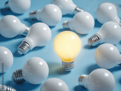 One Bright Idea: A single glowing light bulb stands out among a field of unlit bulbs, symbolizing the power of innovation, ingenuity, and unique thinking.