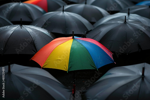 One colorful umbrella in a sea of black umbrellas, representing leadership in bringing change and color to the crowd
