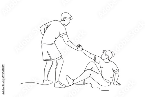 One continuous line drawing of Help a friend who has fallen. Single line draw vector graphic design illustration.