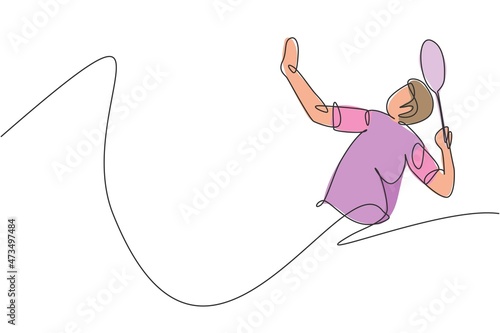One continuous line drawing of young badminton player hit shuttlecock with racket. Competitive sport concept. Dynamic single line draw design vector illustration for tournament match promotion poster