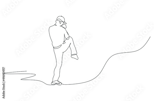 One continuous line drawing of young sporty man baseball player focus practice to throw the ball. Competitive sport concept. Dynamic single line draw design vector illustration for promotion poster
