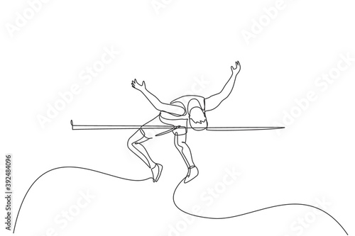 One continuous line drawing of young sporty man practicing pass through the bar in high jump game. Healthy athletic sport concept. Championship event. Single line draw design vector illustration