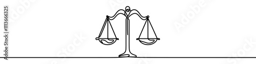 One continuous line illustration of a balance scale, isolated on white background. Line art of a balance scale.