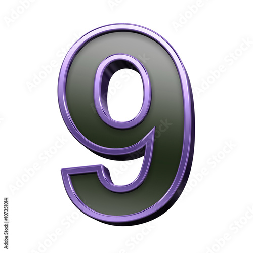 One digit from black with violet shiny frame alphabet set, isolated on white. 3D illustration.