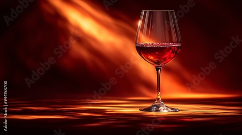 One elegant wine glass with a long, slender stem, set on a reflective surface