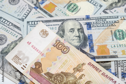 One hundred rubles lying on american dollars as a symbol of weakness russian national currency and strengthening of american dollar