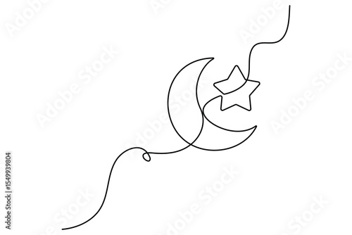 One line drawing of crescent moon and star minimalist ramadan vector design