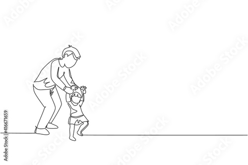 One single line drawing of young dad teaching his daughter learning lead walk at home graphic vector illustration. Happy family parenting concept. Modern continuous line draw design