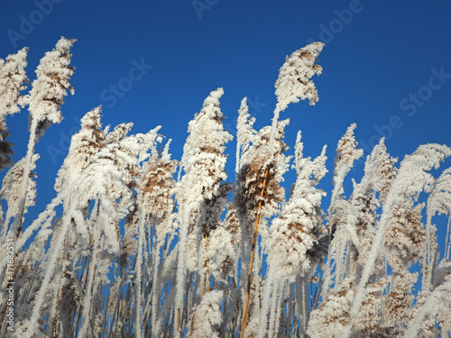 One winter frosty morning. Frosty coastal grass. Reed, reed. A small river bay was covered with ice. Winter. Russia, Ural, Perm region.