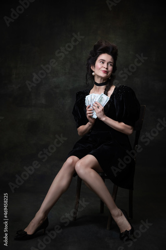 One young attractive woman in image of medieval royal person in black dress isolated on dark vintage background.