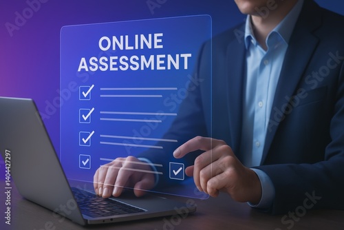 Online Assessment & Modern Education: A professional figure, hands-on the laptop, engaging with an 'online assessment' interface, signifies modern learning and digital educational progress.