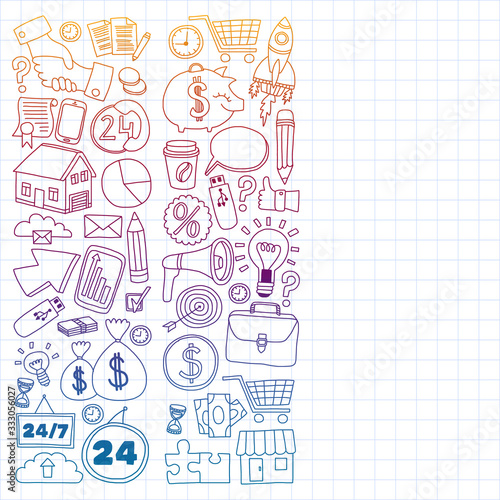 Online business and management school. Pattern with finance icons. Projects organization, risk, development. Team working, budget planning.
