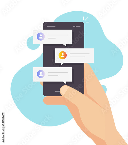 Online chat messages text notification on mobile phone in hand vector or smartphone sms speech bubbles push alerts on screen flat cartoon, digital or electronic chatting on cellphone modern image