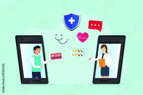 Online doctor vector concept: Young man consulting with female doctor while using mobile phone application
