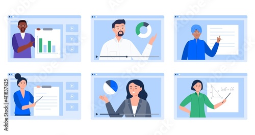 Online education. Webinar, online conferences, lectures, and training. People teaching online. Vector flat illustration.