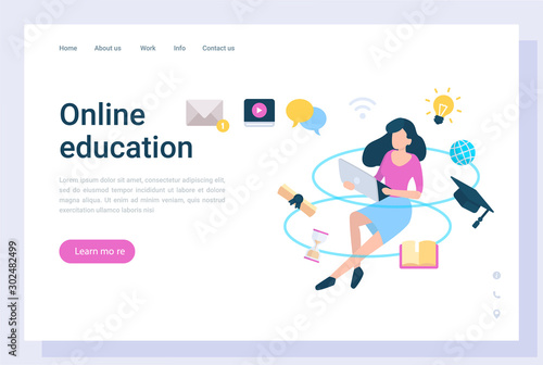 Online education, woman character communication with laptop, e-learning screen. Distance studying and teaching, electronic information, knowledge vector. Website and webpage template, landing page