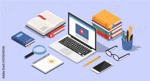 Online Learning Vector Illustration with Laptop and Books