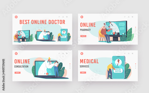 Online Medicine Service Landing Page Template Set. Patients Characters Use Distant Doctor Consultation via Internet