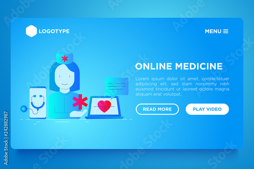 Online medicine web page template: doctor consulting by video call on laptop or smartphone. Telemedicine concept. Gradient flat icons. Modern vector illustration.