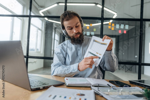 Online meeting, showing document, plan. Businessman is working in the office