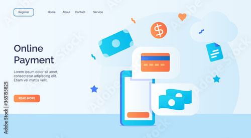 Online payment money card bank smartphone icon campaign for web website home homepage landing template banner with cartoon flat style.