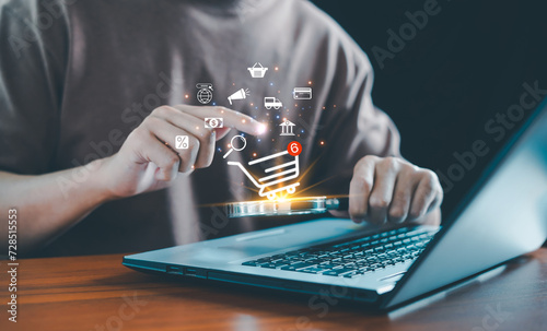 Online shopping and e-commerce technology internet concept, Man or Shopper using smartphone with shopping cart and business icon, sale, Shopping service on the online web and offers home delivery.
