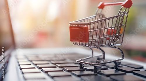 Online Shopping Cart: A miniature shopping cart sits atop a laptop keyboard, symbolizing the convenience and accessibility of online shopping, perfectly capturing the modern retail experience.