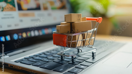 Online Shopping Concept: Mini Shopping Cart with Boxes on Laptop Keyboard Representing E-commerce and Internet Shopping