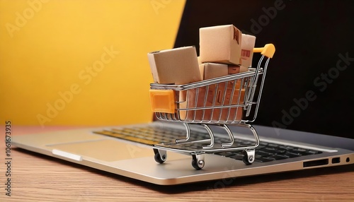 Online shopping concept with miniature shopping cart standing in front of laptop