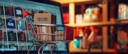 Online shopping concept,shopping cart full of boxes above laptop computer