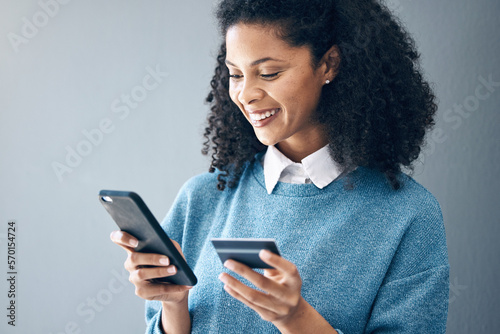 Online shopping, credit card and woman with phone in studio for advertising on grey background. Ecommerce, banking and finance payment with app, transfer or savings on mockup or isolated copy space