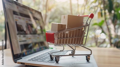 Online Shopping E-Commerce Concept: Cashier and Cart on Laptop Keyboard